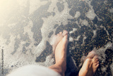 Women's bare feet on a pebble beach near the sea on a sunny day, toned. Vacation background