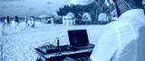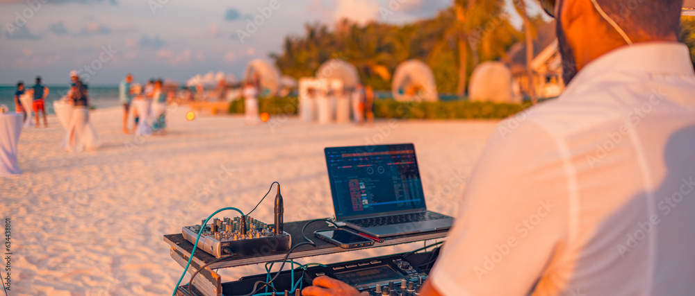 Dj mixing at sunset beach party in summer vacation outdoors. Beach sunset party, playing music for tourist people in bar fun concept. Maldives resort panorama, leisure lifestyle