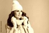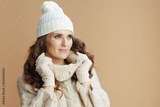 pensive trendy woman in beige sweater, mittens and hat on beige