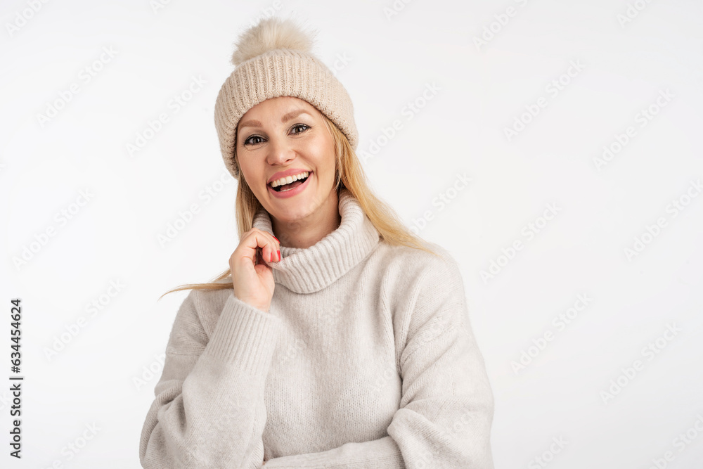 Cheerful smiling londe-haired woman wearing knit hat and sweater and standing against a white background