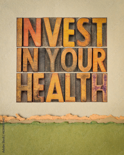 invest in your health - word abstract in vintage letterpress wood type against art paper, healthcare and healthy lifestyle concept