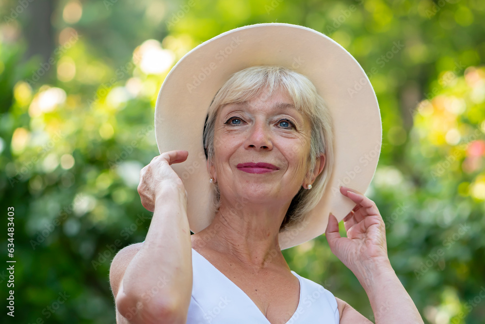 Happy elderly beautiful woman 60-65 years old in white hat on the background of nature.