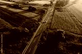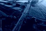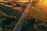 Aerial shot of traffic on countryside road in summer sunset, high angle view drone pov image of cars driving along the highway through Vojvodina