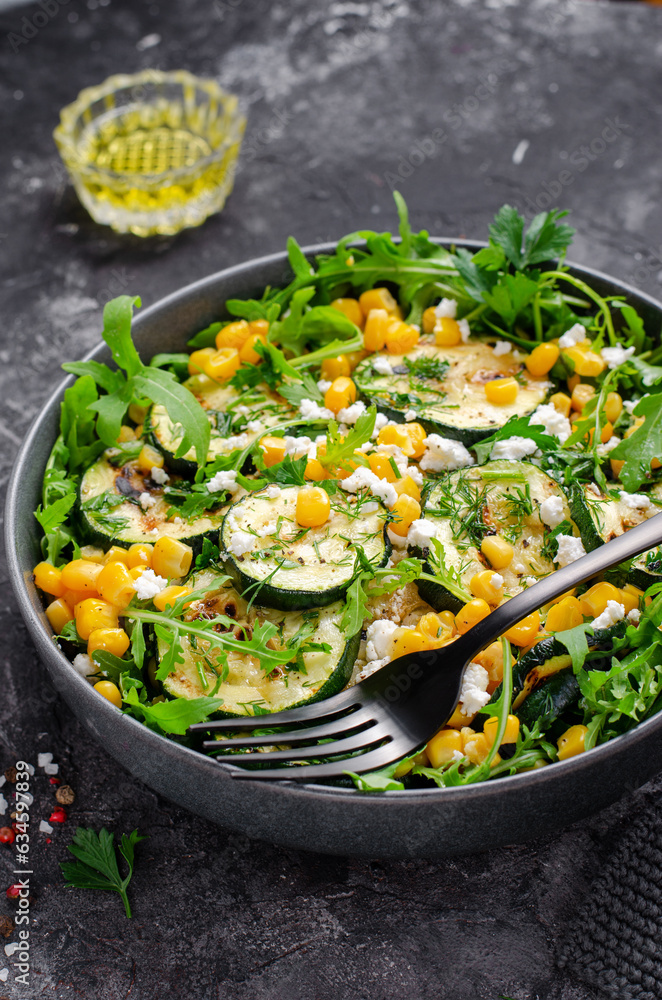Grilled Zucchini Warm Salad, Zucchini, Fetam Corn and Herbs Appetizer, Salad on Dark Background