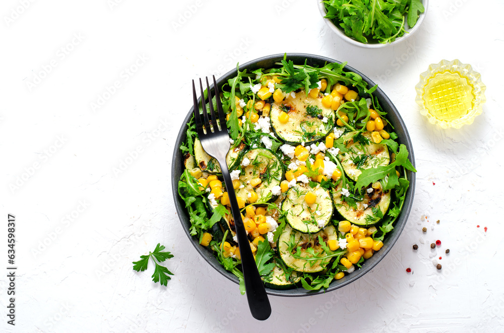 Grilled Zucchini Warm Salad, Zucchini, Fetam Corn and Herbs Appetizer, Salad on Bright Background