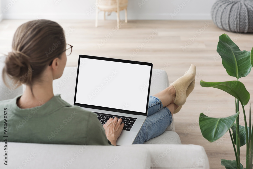 Young woman using laptop computer with blank empty mockup screen. Business woman working at home. Freelance, student lifestyle, e-learning, shopping online, web site, technology concept