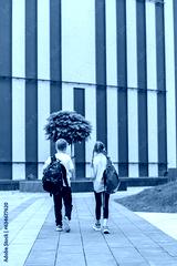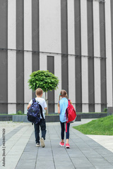 Back to school. Teenagers with backpacks go to school to study. Meeting friends