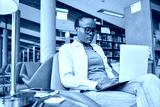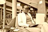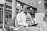 Busy short-haired African girl student using laptop technology sitting in university campus library. Serious young Black woman elearning looking at computer advertising hybrid work and elearning.
