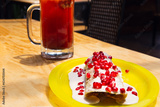 Traditional Mexican dish of chiles en nogada. Mexican food, chiles en nogada and clamato beer. Michelada beer with tomato juice and chiles en nogada. Concept of traditional food and mexican drink