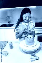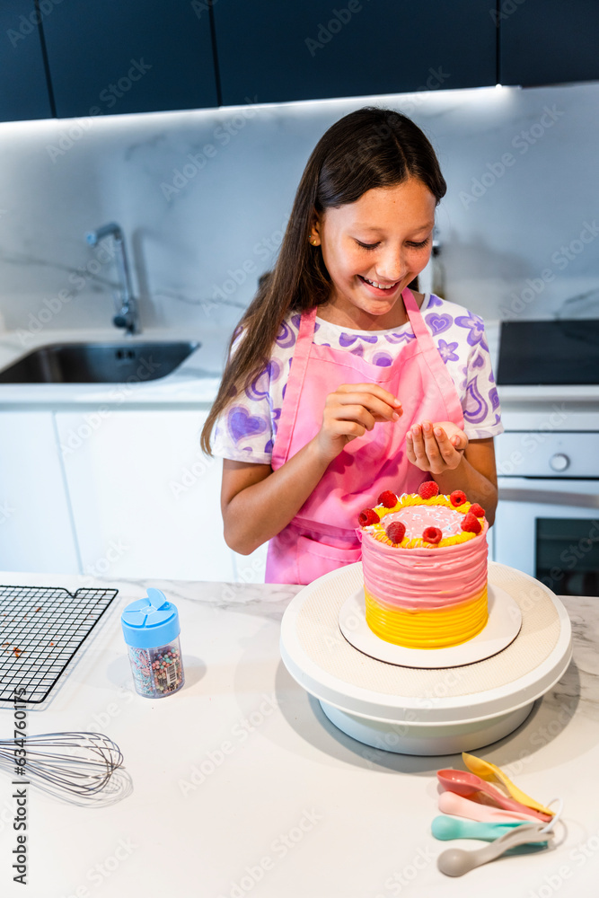 Mother and daughter cooking together. Daughter decorating her cake with strawberries.