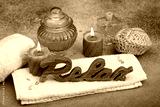 Spa- und Wellnessbereich mit Duftkerze, Blumen und dem Schriftzug Relax.