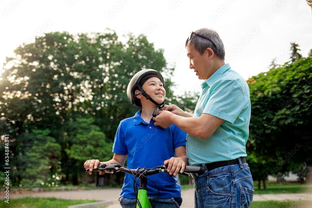 father puts protective helmet on his Asian son's head, Korean boy rides bike with dad in the park in summer