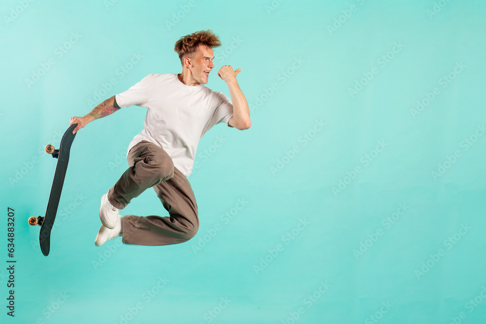 young crazy guy rides skateboard and jumps on blue isolated background, hipster in sunglasses flies