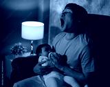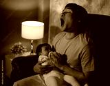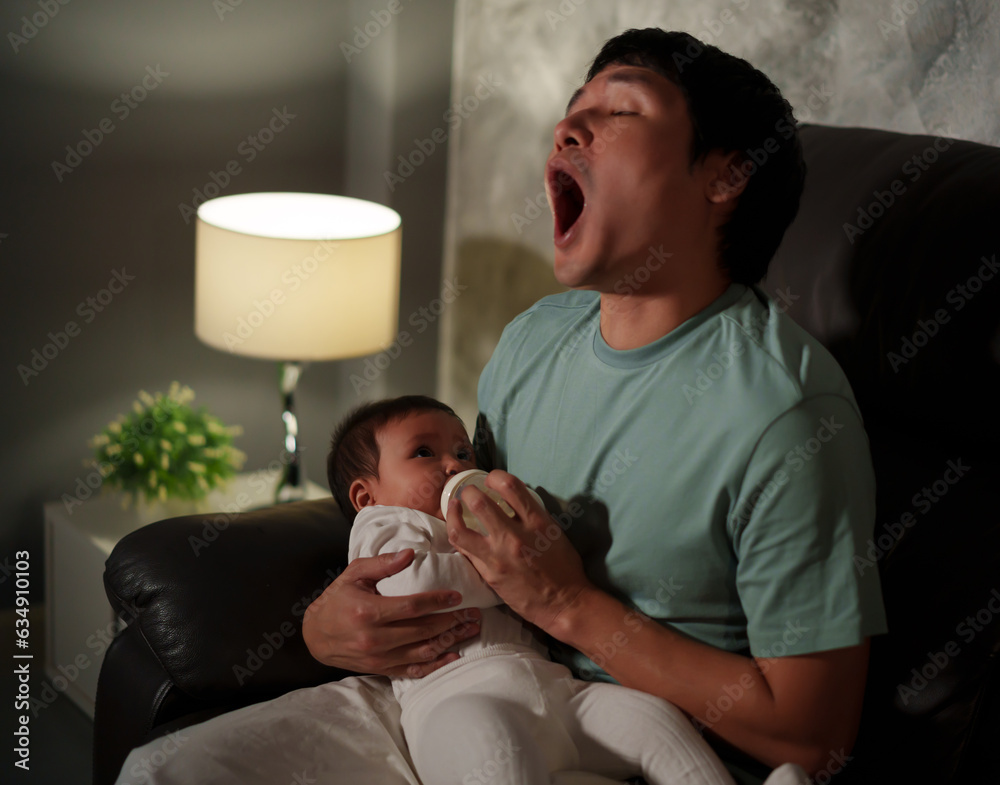 sleepy father yawning and feeding milk bottle to infant baby on sofa in the living room at night