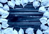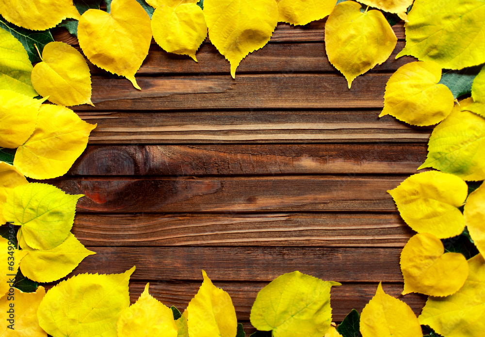 Background group of autumn yellow leaves on a brown wooden background. Frame.
