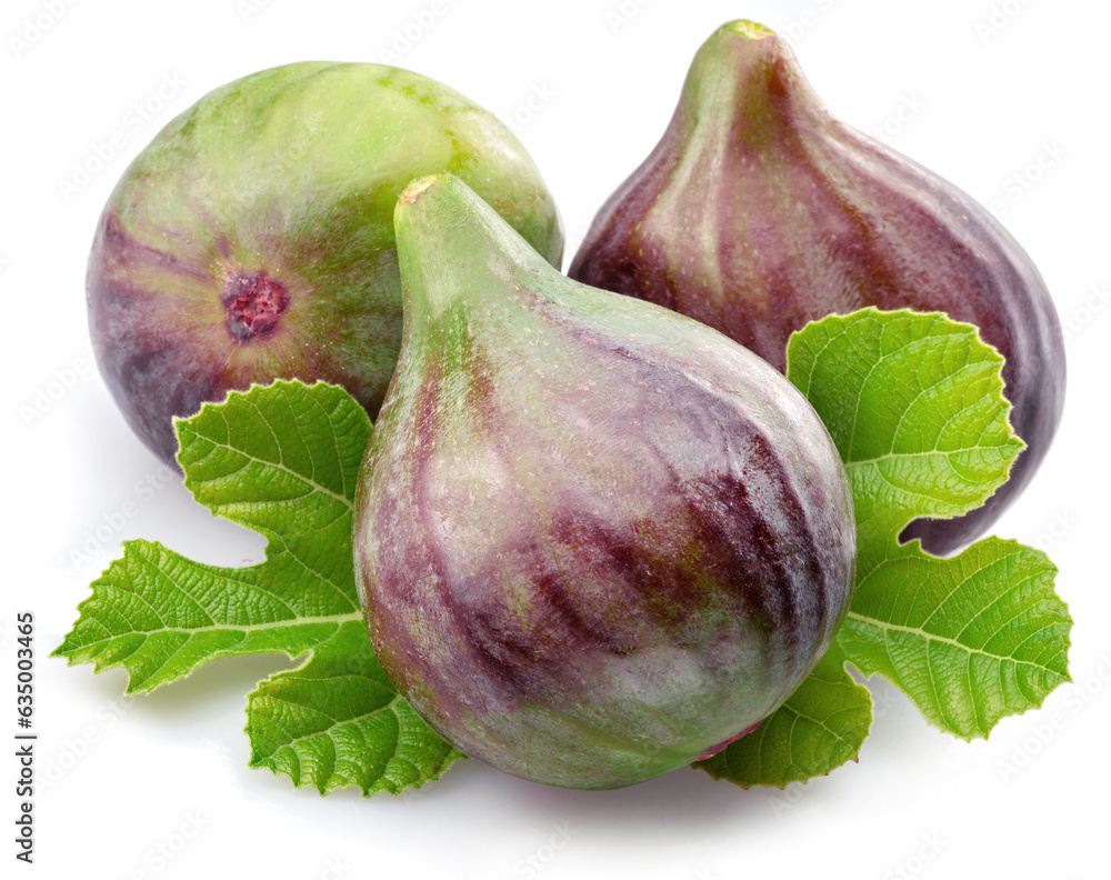 Fig fruits with fig leaves isolated on white background.