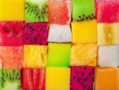 Fruit puzzle. Colorful food background or pattern arranged of different fruit cubes. Dietary concept.