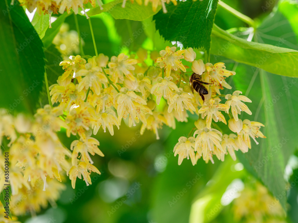 Bee between linden flowers and abundance of foliage leaves. Lime tree or tilia tree in blossom. Summer nature background.