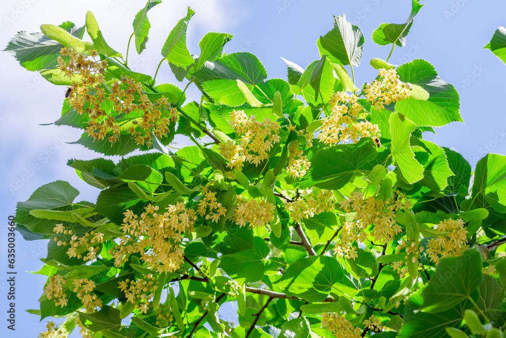 Linden flowers between abundant foliage leaves. Lime tree or tilia tree in blossom. Blue sky at the background.