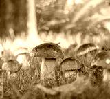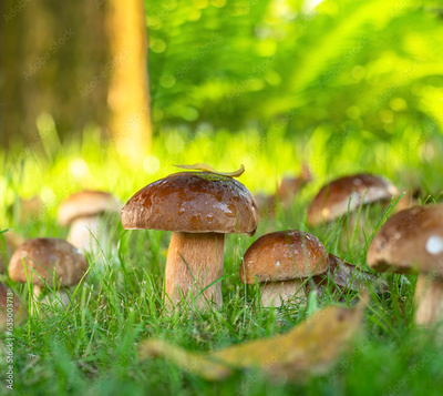 Porcini mushrooms between fresh green grass in the sunny forest. Close-up.