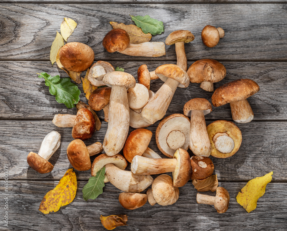 Fresh harvest of porcini mushrooms on wooden table. Lucky result of mushroom picking.