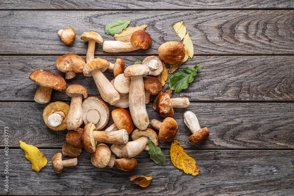 Fresh harvest of porcini mushrooms on wooden table. Lucky result of mushroom picking.