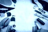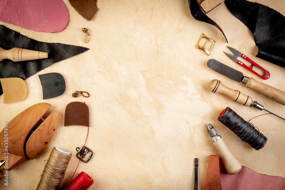 Leather workshop tools on the table. Handbag or shoe manufacturing industry