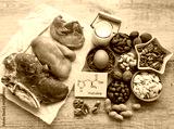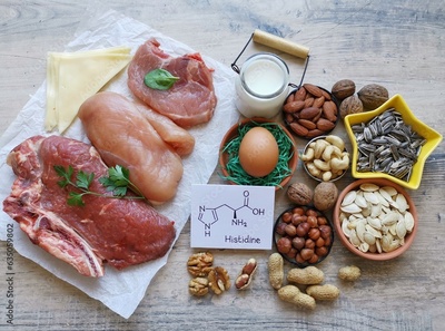 Histidine rich food with structural chemical formula of essential amino acid histidine. Natural food sources of histidine include high protein foods like eggs, dairy products, meat, nuts, seeds.