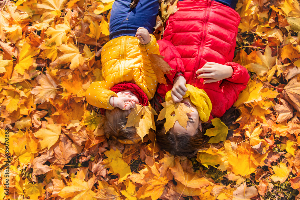 Autumn child in the park with yellow leaves. Selective focus.