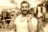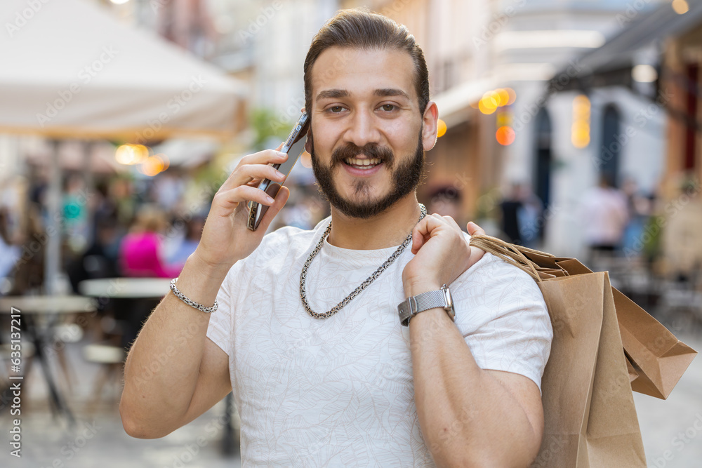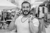 Joyful smiling bearded young man shopaholic consumer after shopping sale with full bags with gifts outdoors. Guy tourist traveler walking along the urban sunshine city street road. Town lifestyles