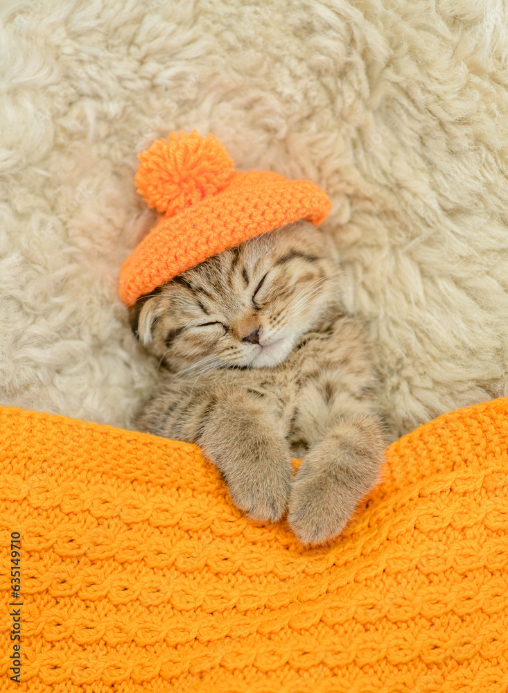 Cozy kitten wearing warm hat sleeps under blue blanket on a bed at home. Top down view