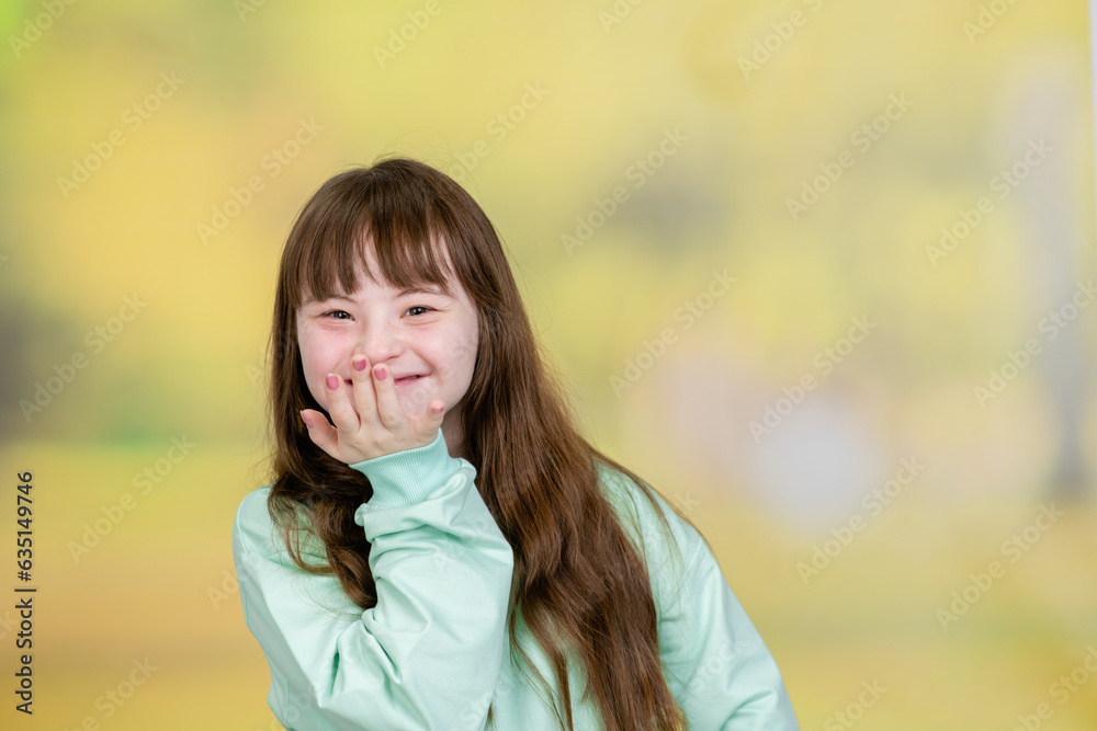 Happy teen girl with Downs syndrom stands at summer park. Empty space for text