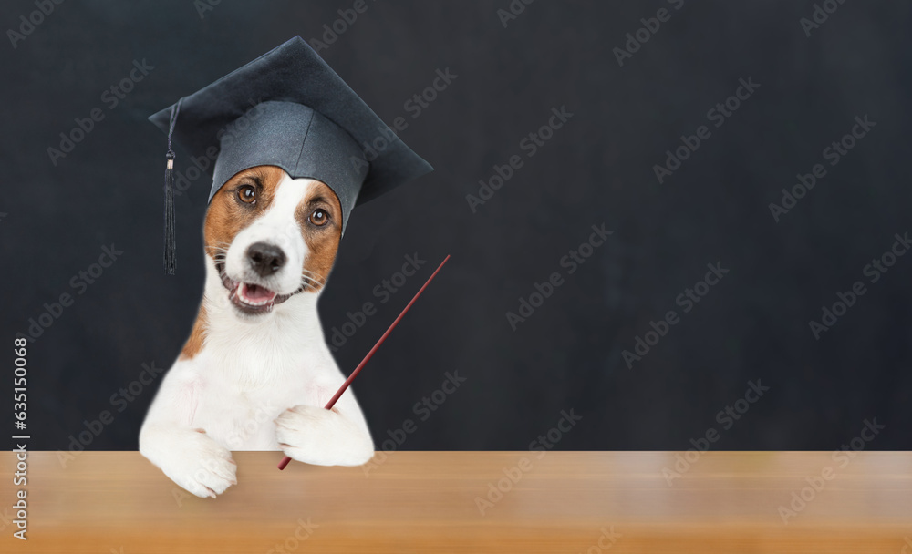 Smart jack russell terrier puppy wearing eyeglasses and graduation hat sits near black chalkboard at school and points away on empty space