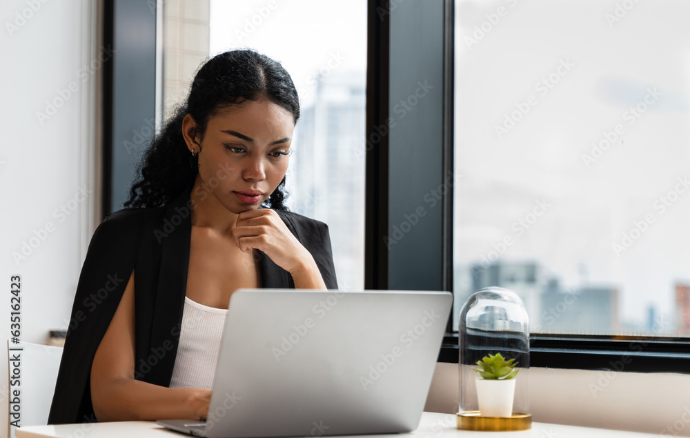 Confident black businesswoman or business owner working on a laptop researching business on the Internet. Gen Z employees who enjoy their work are coming up with ideas to plan responsible projects.