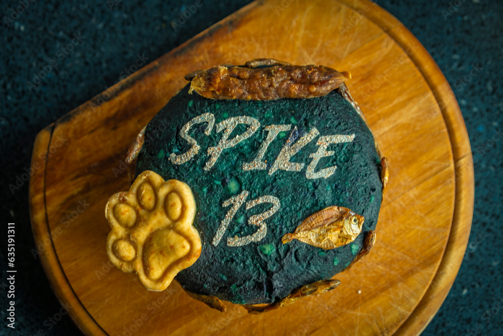 Pit bull dog birthday day in blue pet bed with 13 years meat cake with fishes