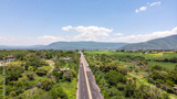 Aerial view of the highway passing through the green field and mountains in Mexico.
