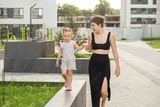 Toddler girl walking holding mom's hand outdoors. Family, motherhood and love concept.