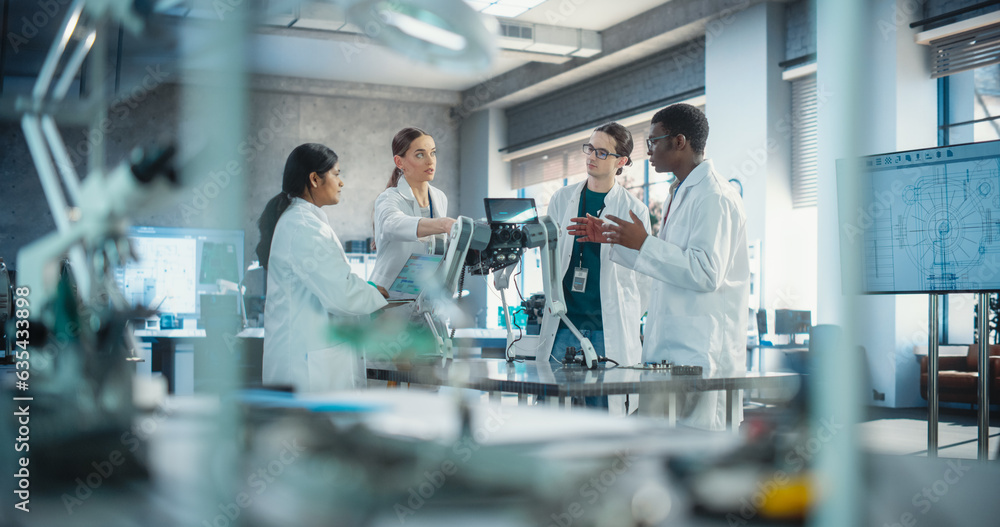 Professional Young International Team of Female and Male Engineers Discussing Industrial AI Robot Dog in Factory Development Workshop. Tech Facility with Machines, Computers and Research Equipment