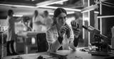 Female Engineer Fixing a High-Tech Bionic Hand Component. On Blurred Background Industrial Robotics Specialists in Lab Coats Working on a Mobile AI Robot in a Tech Factory Facility