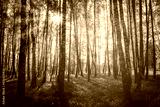 Sunset or sunrise in a spring birch forest with bright young foliage glowing in the rays of the sun. Vintage film aesthetic.