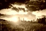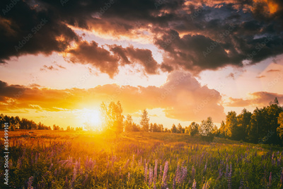 Sunset or sunrise on a field with wild lupines and wildflowers and dramatic cloudy sky in summertime. Vintage film aesthetic.