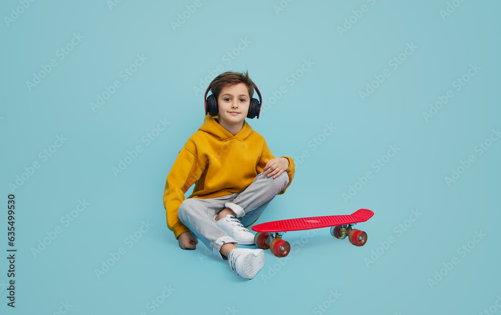 Stylish youngster listening to music near longboard