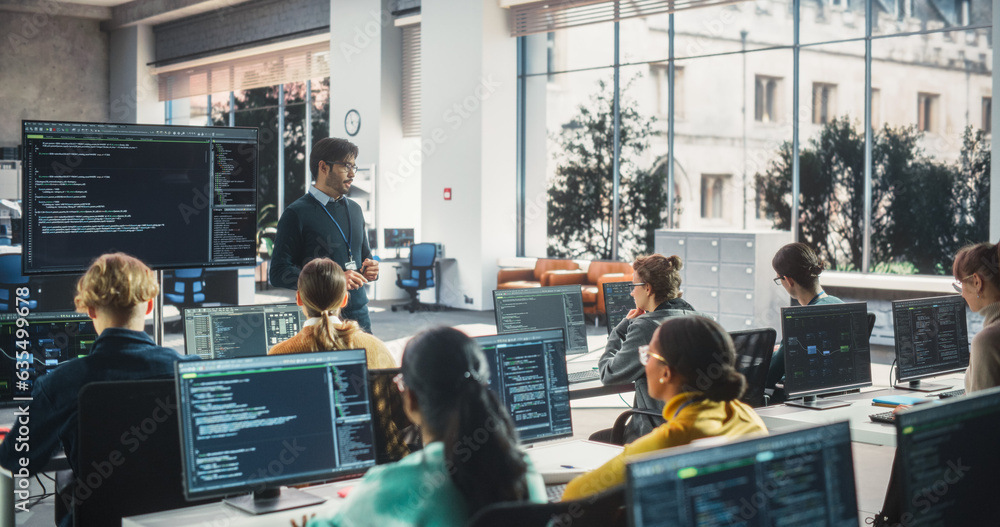 Teacher Giving Lesson to Diverse Multiethnic Group of Female and Male Students in College Room. Class Learning About Computer Science and Software Development. Lecturer Shares Knowledge with Scholars