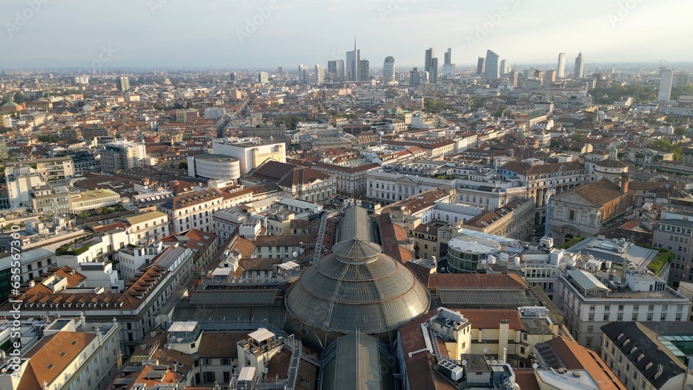 Europe, Italy , Milan - Drone aerial view of Piazza Duomo in city downtown - contrast between Vittorio Emanuele Gallery and the new modern skyline with skyscrapers in Garibaldi
