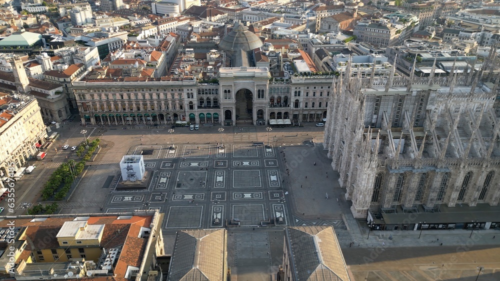 Europe, Italy, Milan - Aerial view of Piazza Duomo, gothic Cathedral in downtown center city. Drone aerial view of Vittorio Emanuele gallery and new skyline - Duomo Unesco Heritage sightseeing