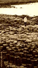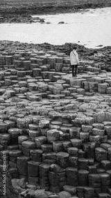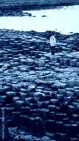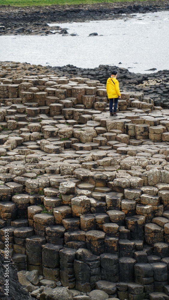 person in yellow jacket walking through hexagonal rocks, giant's causeway