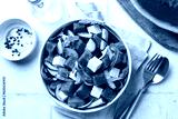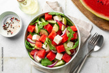 Top view of Fresh summer salad with watermelon, arugula, feta, cucumber salad, healthy food eating. White table background.