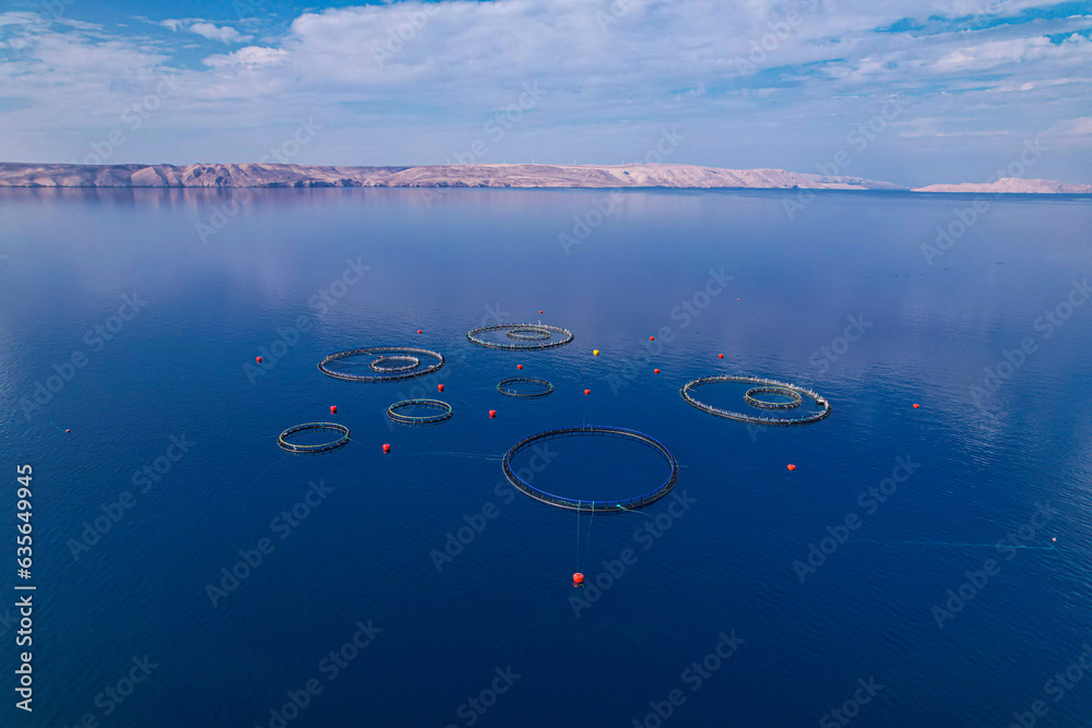 AERIAL: Round net pen enclosures for fish farming in the middle of Adriatic Sea