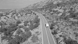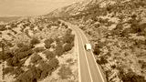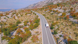 AERIAL: Camper van travelling through beautiful landscape along Adriatic highway