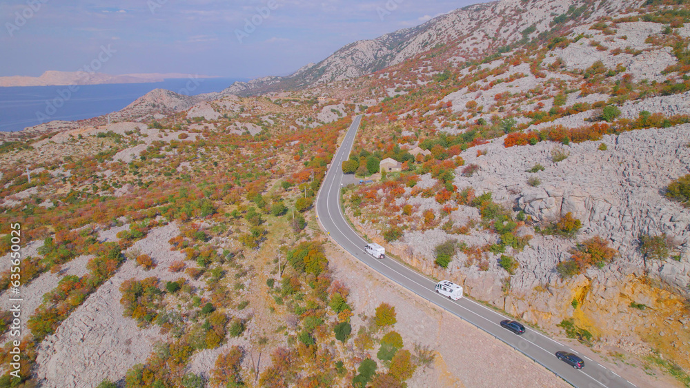 AERIAL Two cars follow motorhomes while drive along picturesque Adriatic highway
